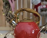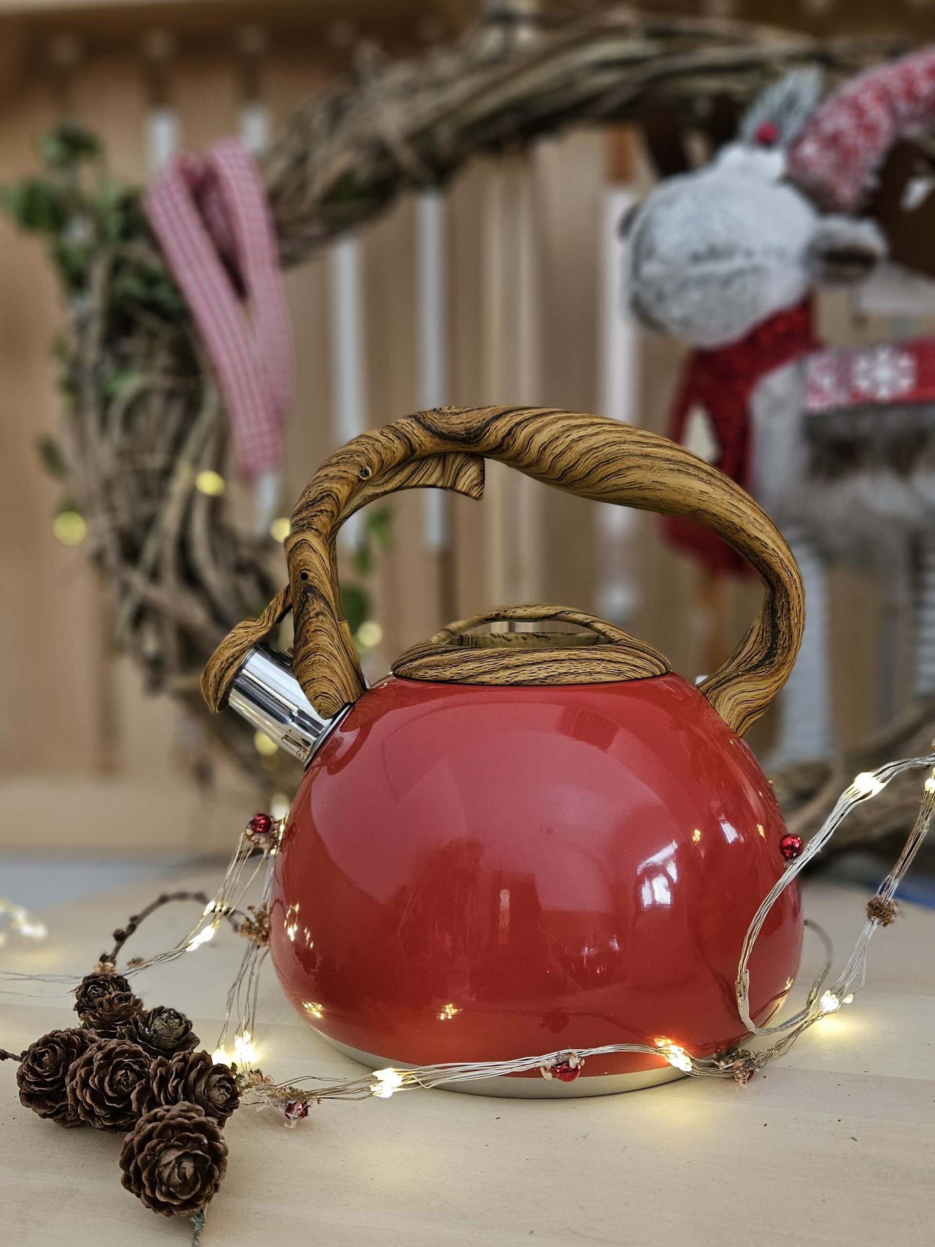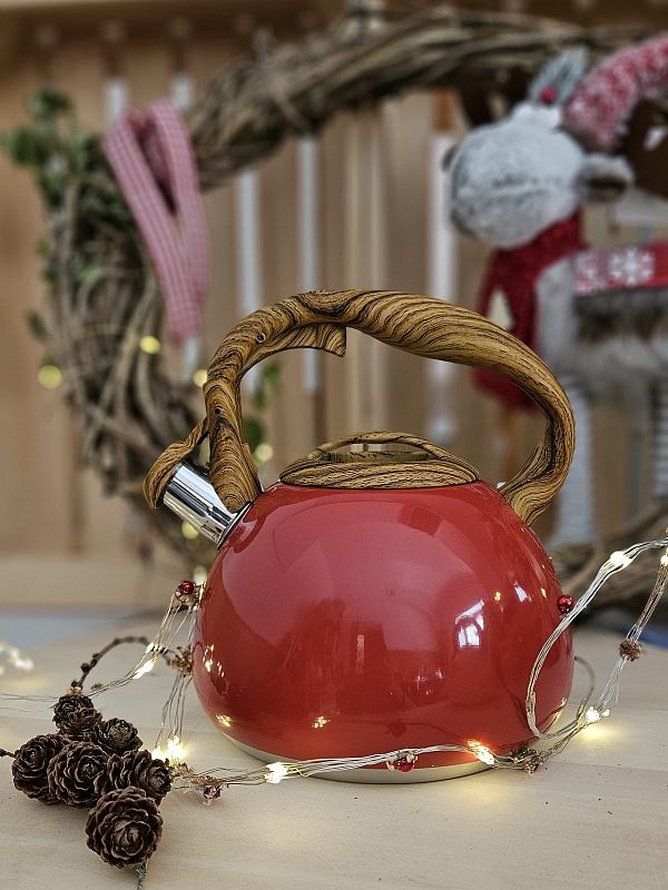 Rdeč emajliran čajnik z lesenim ročajem. Drži 3 litre. Primeren je za uporabo na vseh kuhališčih.