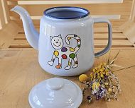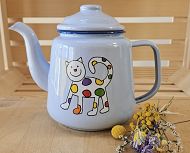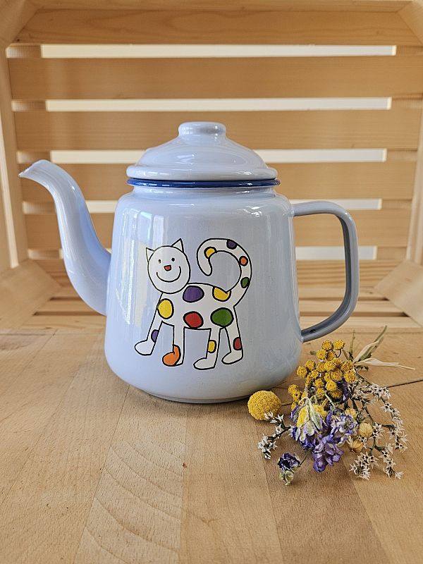 Emajliran čajnik v svetlo modri barvi z motivom pisanega mucka. Drži 1,5 litra. Proizvajalec je češko podjetje Smaltum. Primeren je za vsa kuhališča, tudi za indukcijo.