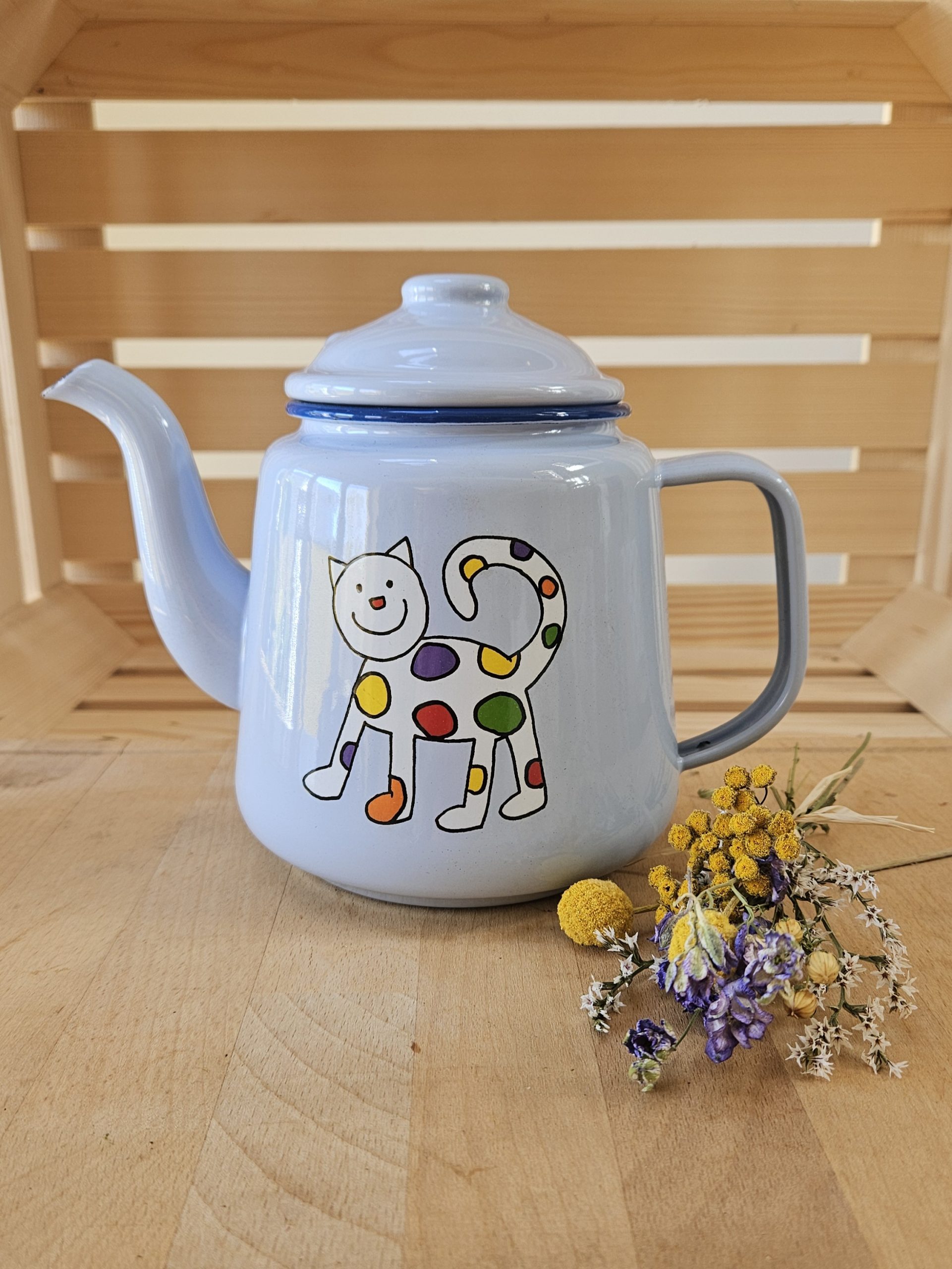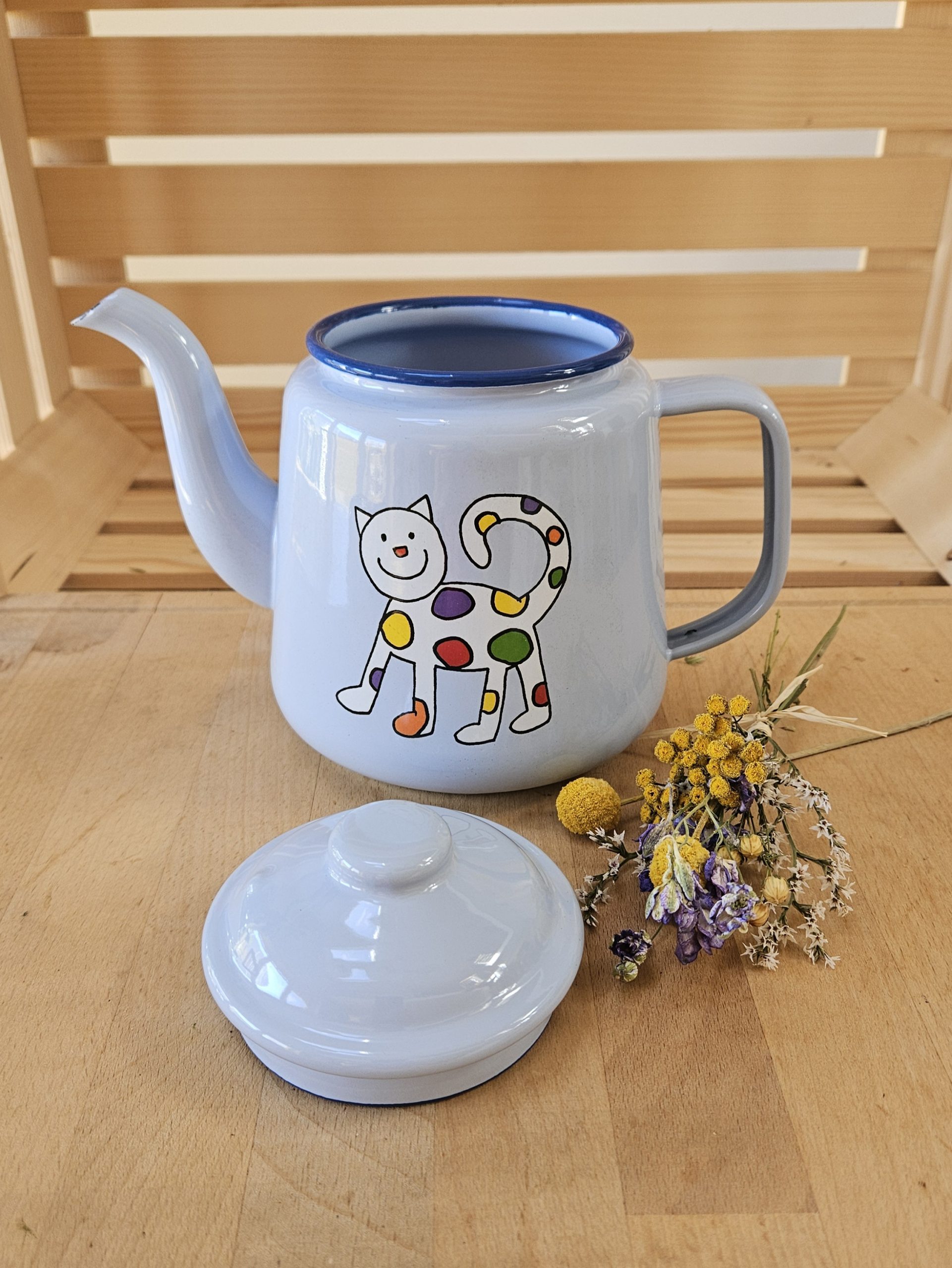 Emajliran čajnik v svetlo modri barvi z motivom pisanega mucka.