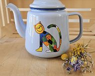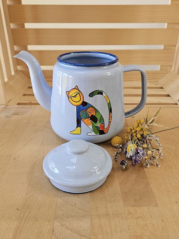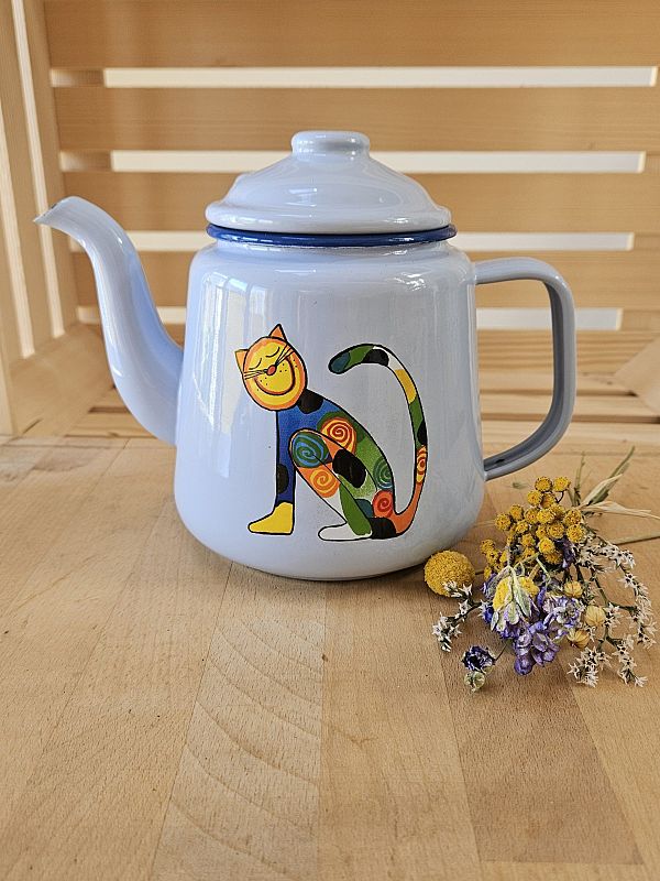 Emajliran čajnik v svetlo modri barvi z motivom pisanega mucka. Drži 1,5 litra. Proizvajalec je češko podjetje Smaltum. Primeren je za vsa kuhališča, tudi za indukcijo.