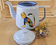 Emajliran čajnik v svetlo modri barvi z motivom pisanega mucka.