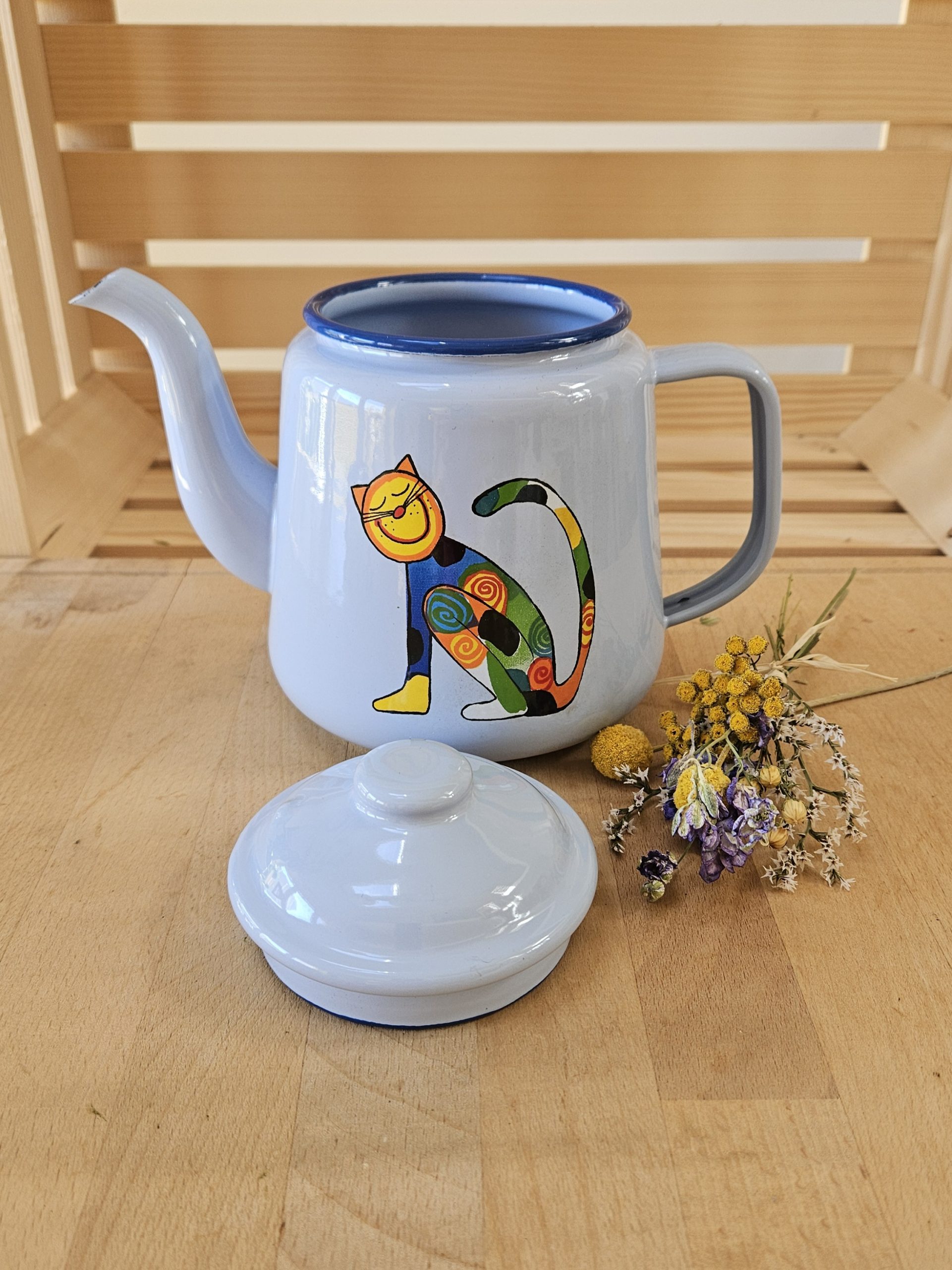 Emajliran čajnik v svetlo modri barvi z motivom pisanega mucka.