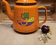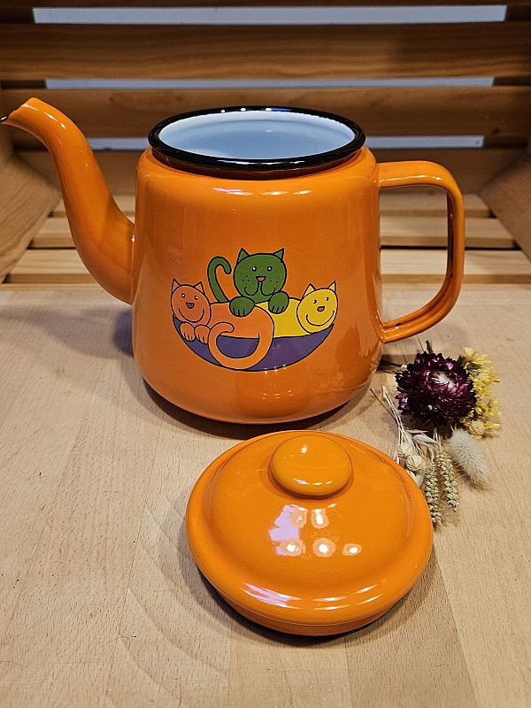 Emajliran čajnik v oranžni barvi z motivom pisanih muckov.