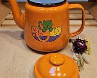 Emajliran čajnik v oranžni barvi z motivom pisanih muckov. Drži 1,5 litra. Proizvajalec je češko podjetje Smaltum. Primeren je za vsa kuhališča, tudi za indukcijo.