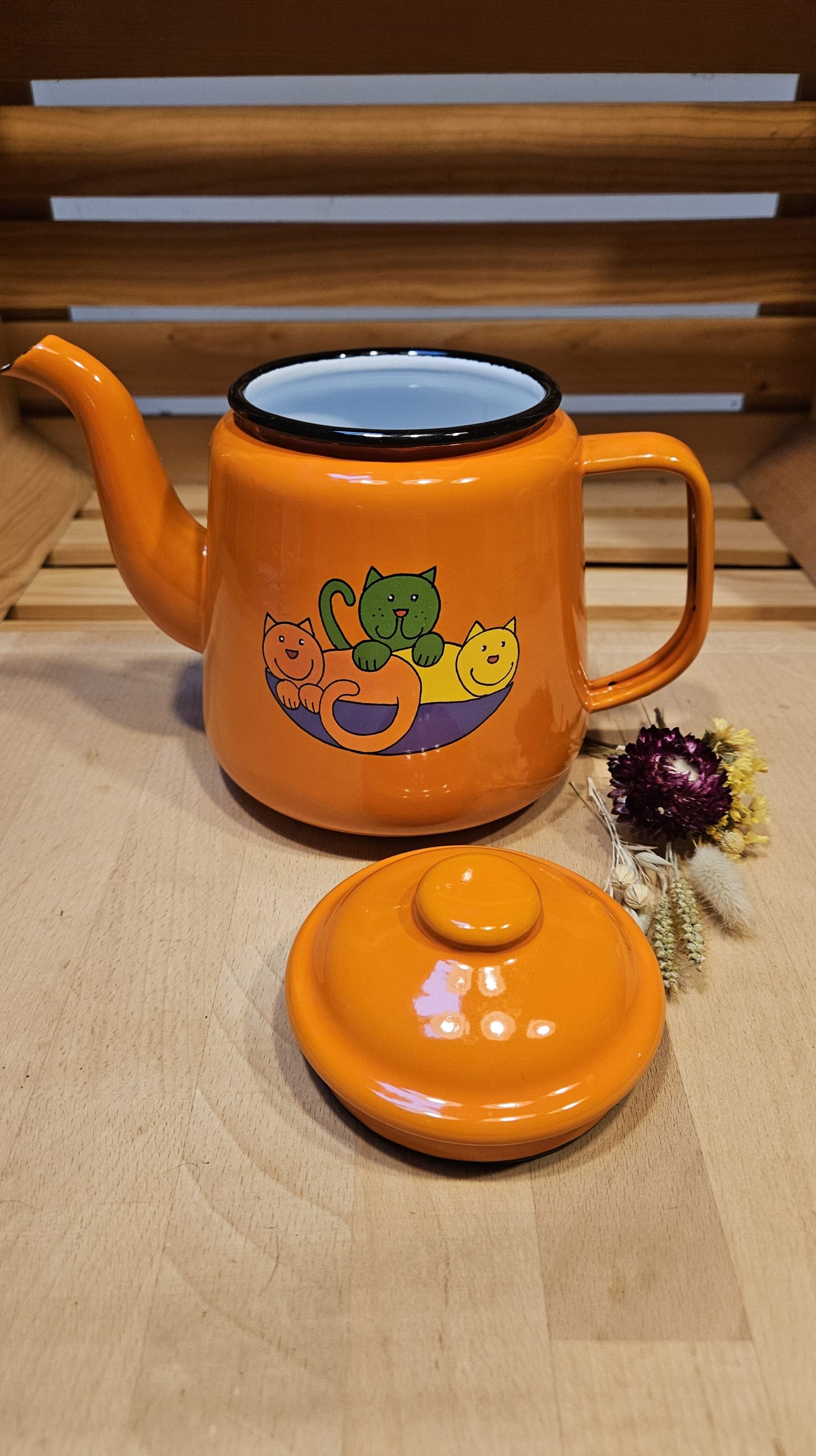 Emajliran čajnik v oranžni barvi z motivom pisanih muckov.