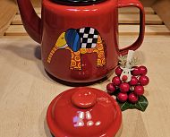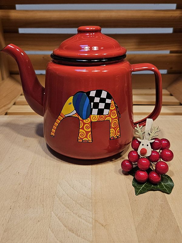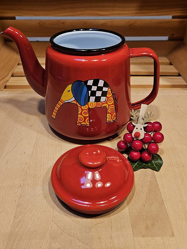 Emajliran čajnik v rdeči barvi z motivom pisanega slončka. Drži 1,5 litra. Proizvajalec je češko podjetje Smaltum. Primeren je za vsa kuhališča, tudi za indukcijo.