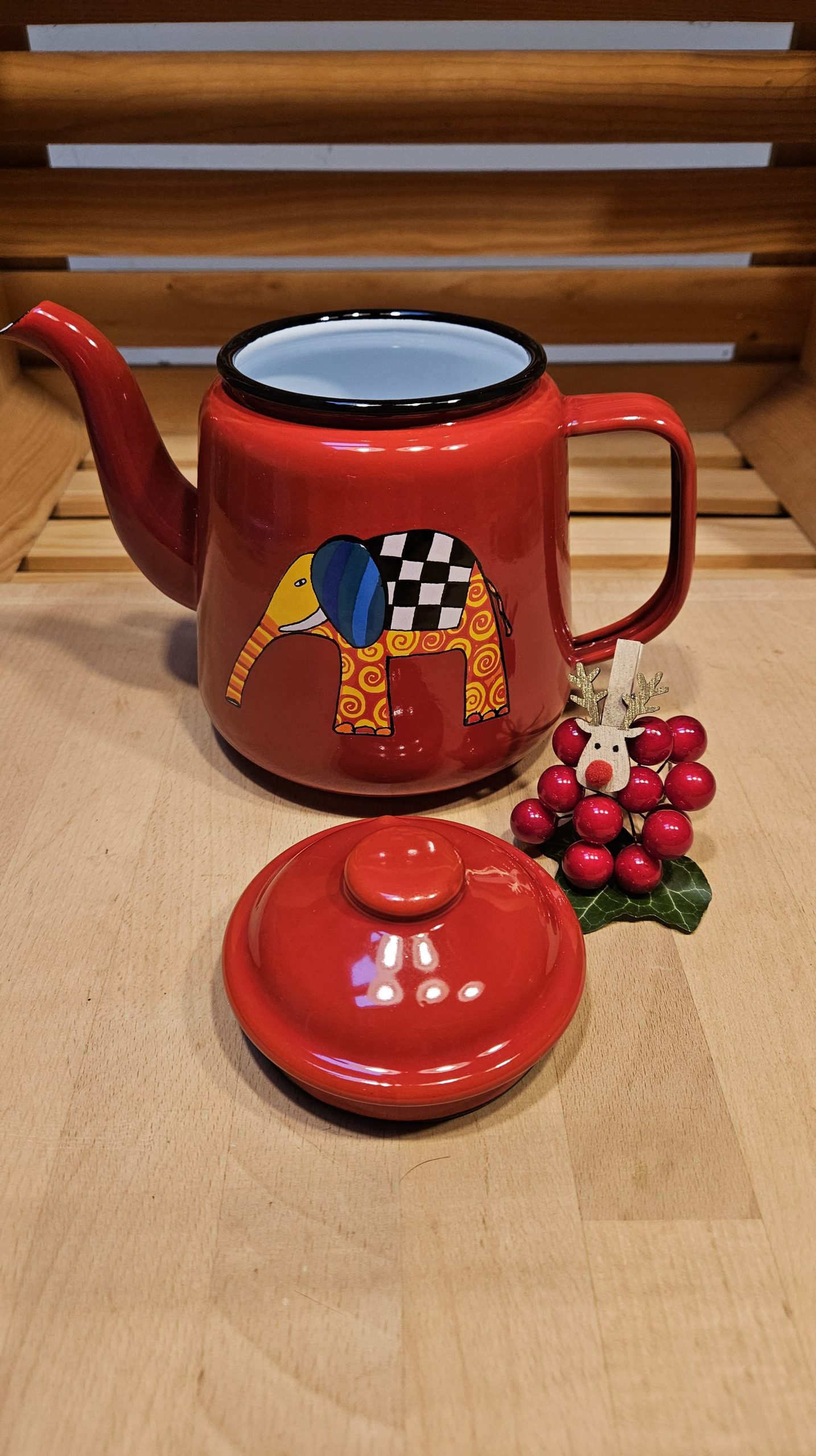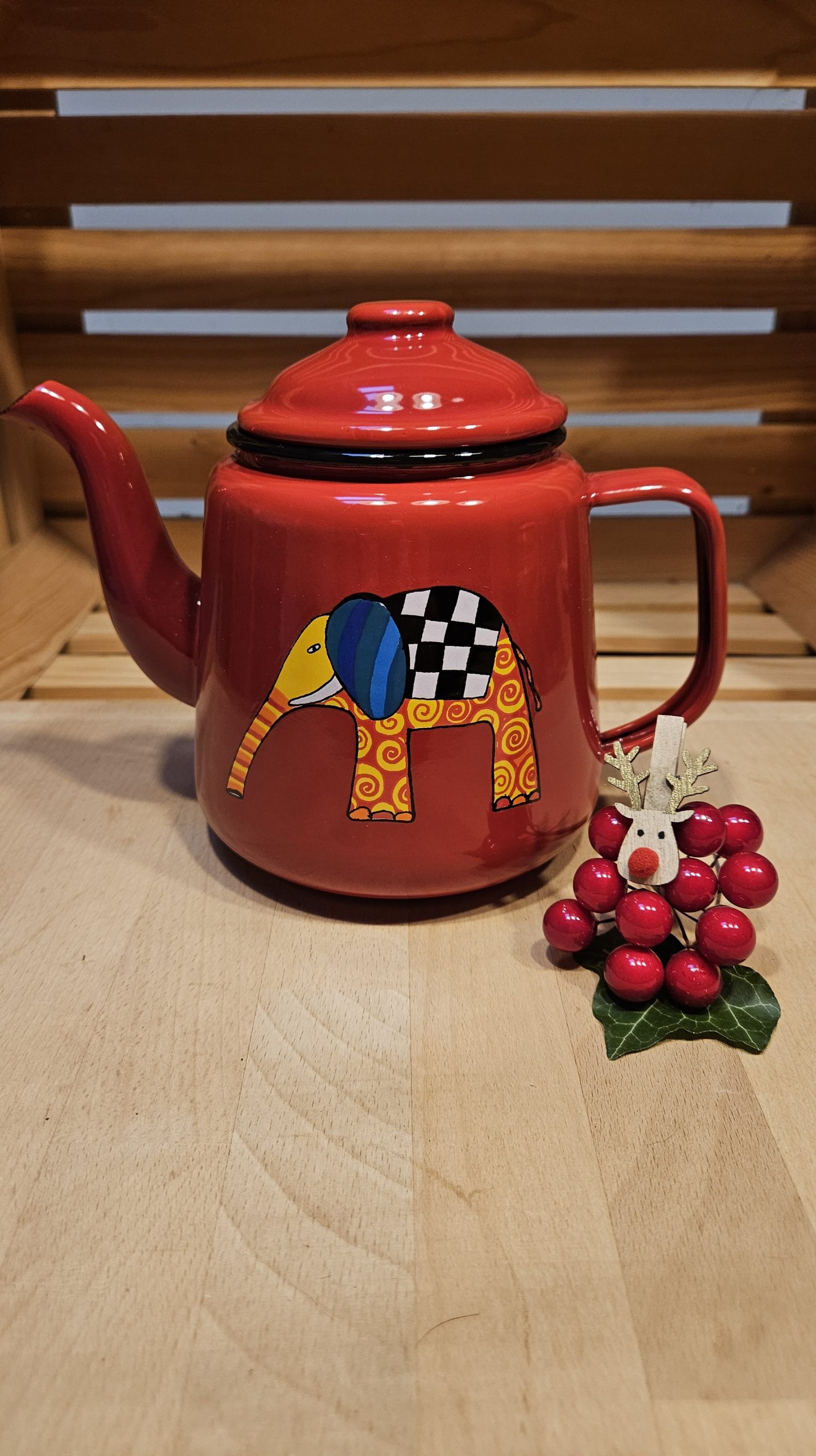 Emajliran čajnik v rdeči barvi z motivom pisanega slončka.