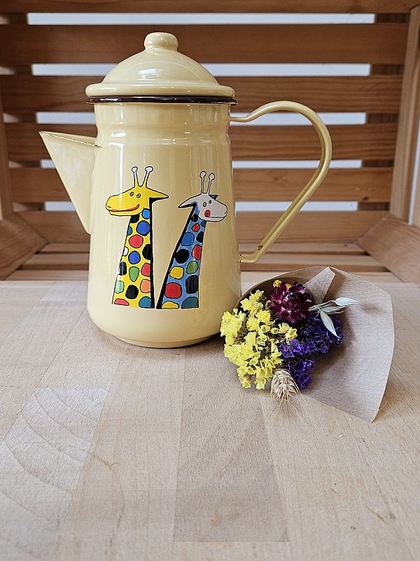 Emajliran čajnik v rumeni barvi z motivom dveh pisanih žirafic. Drži 1 liter. Proizvajalec je češko podjetje Smaltum. Primeren je za uporabo na vseh kuhališčih, tudi na indukciji.