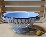 Cedilo je emajlirano v svetlo modri barvi z motivom pisanih žirafic. Ima stojalo, tako da samostojno stoji. Z njim precejamo testenine in solato. Lahko ga peremo v pomivalnem stroju.
