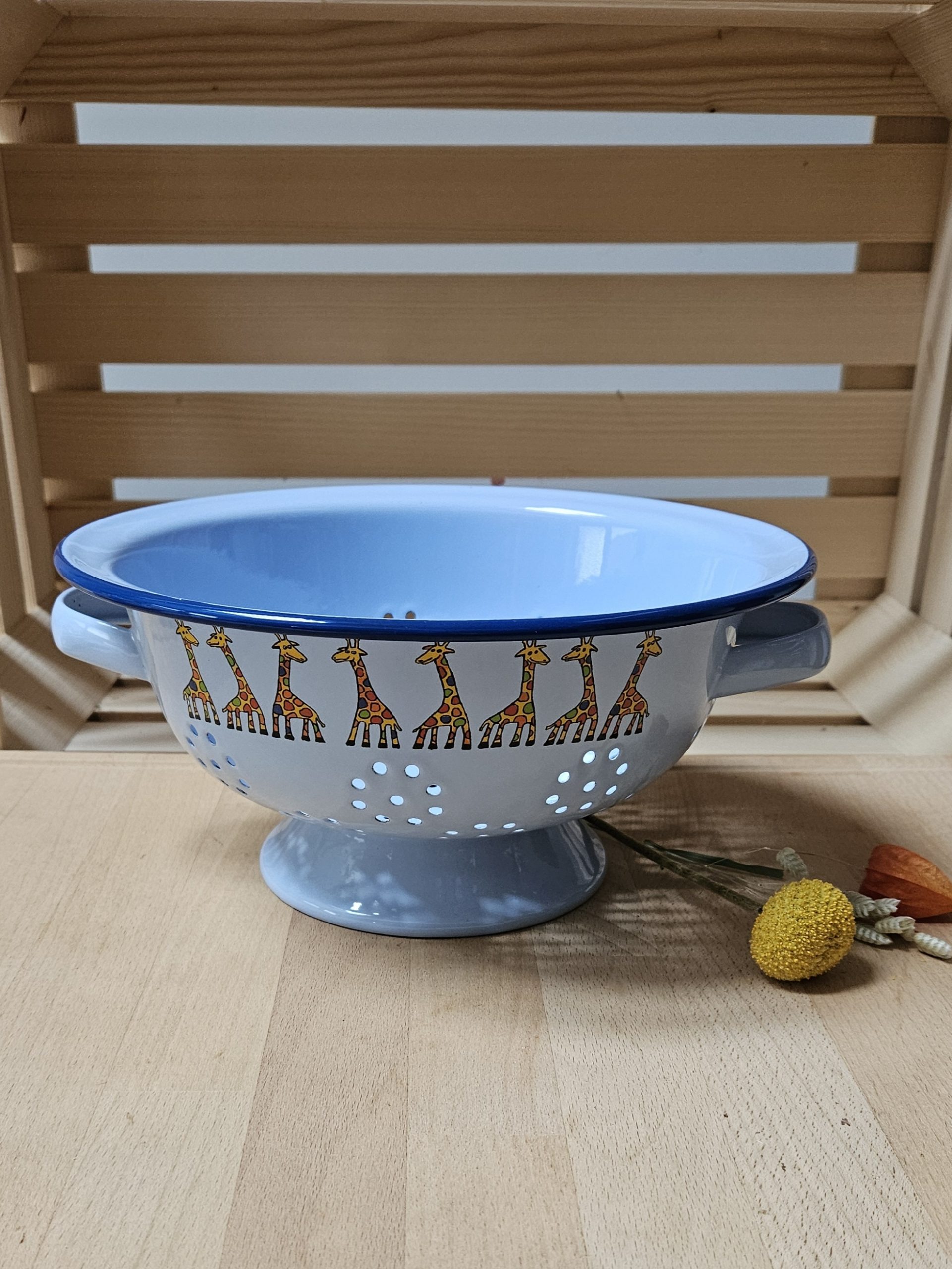 Cedilo je emajlirano v svetlo modri barvi z motivom pisanih žirafic. Ima podstavek, da samostojno stoji. Drži 2,5 litra. Z njim precejamo testenine, solato. Peremo ga lahko v pomivalnem stroju.