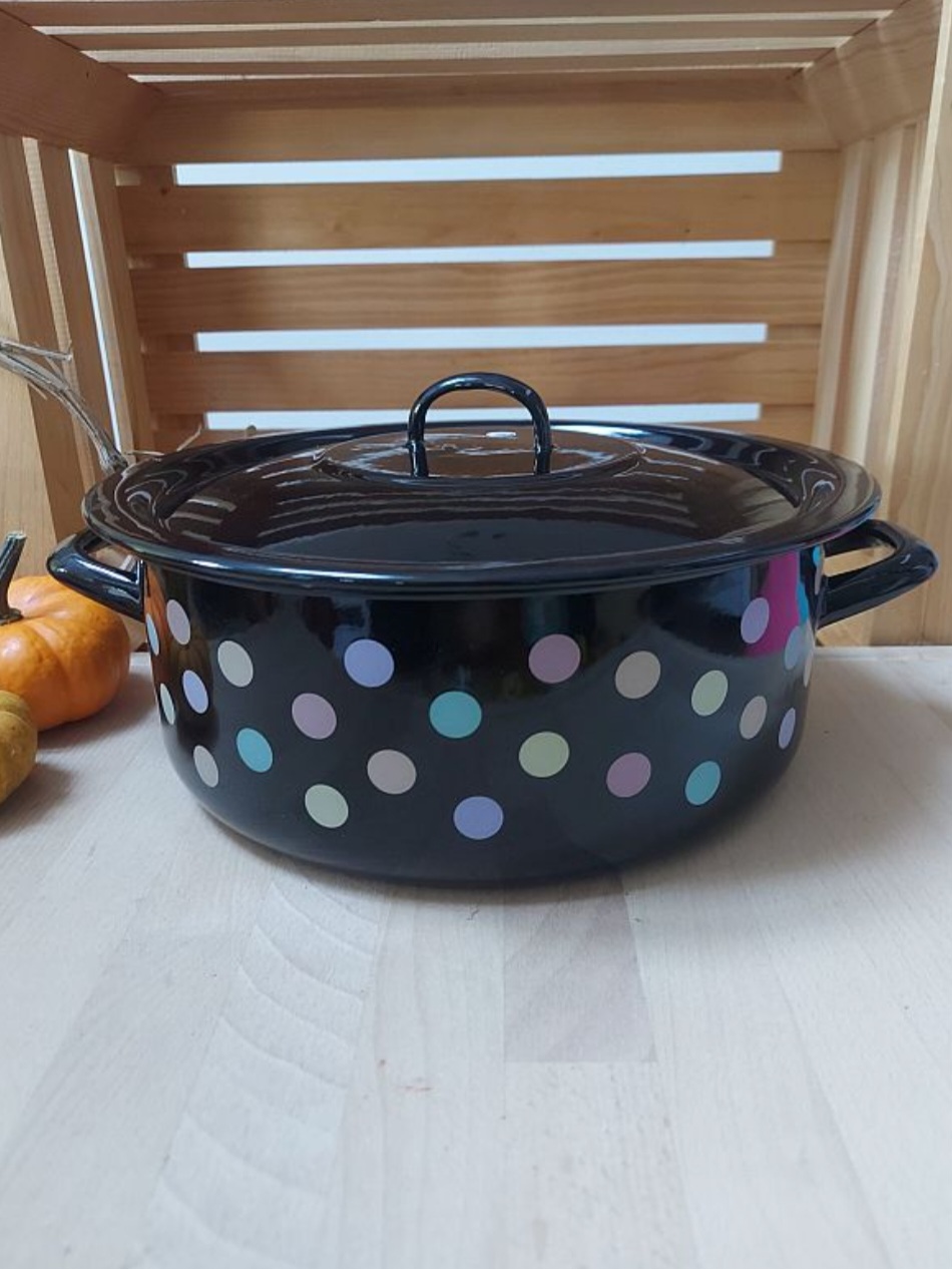 Komplet emajlirane črne posode s pastelnimi pikami 7-delni