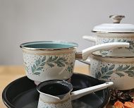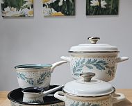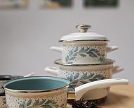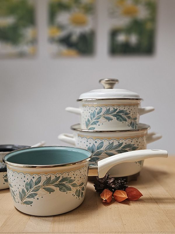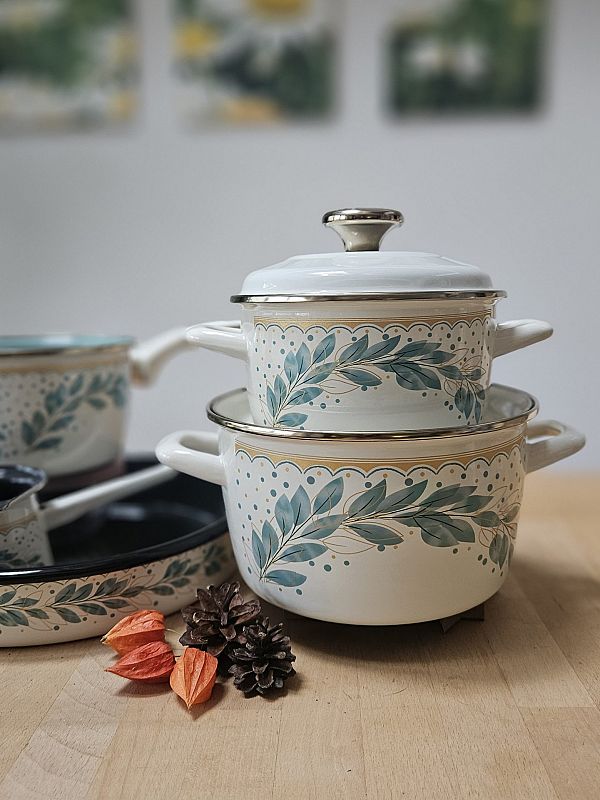 Komplet emajlirane posode vsebuje 2 različni velikosti kozici s pokrovkama, kozico z enim ročajem brez pokrovke, džezvo in okrogli pekač. Vse posode so primerne za  uporabo na vseh kuhališčih, tudi na indukciji.