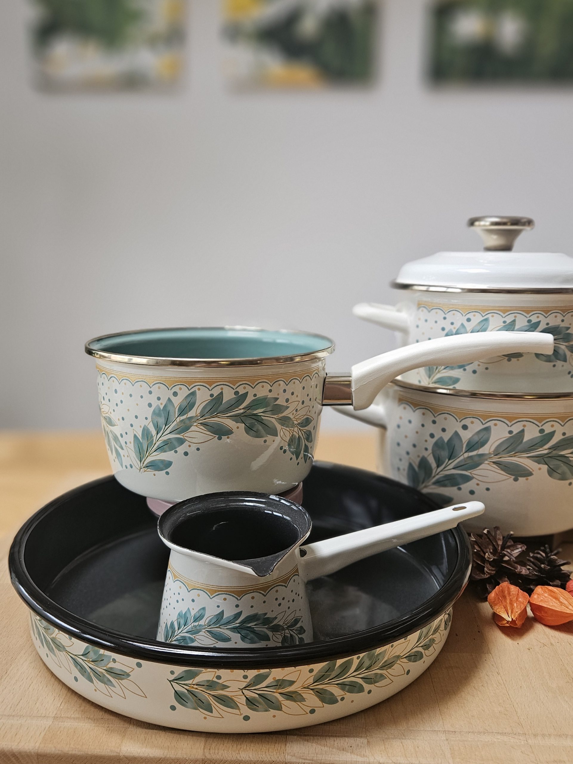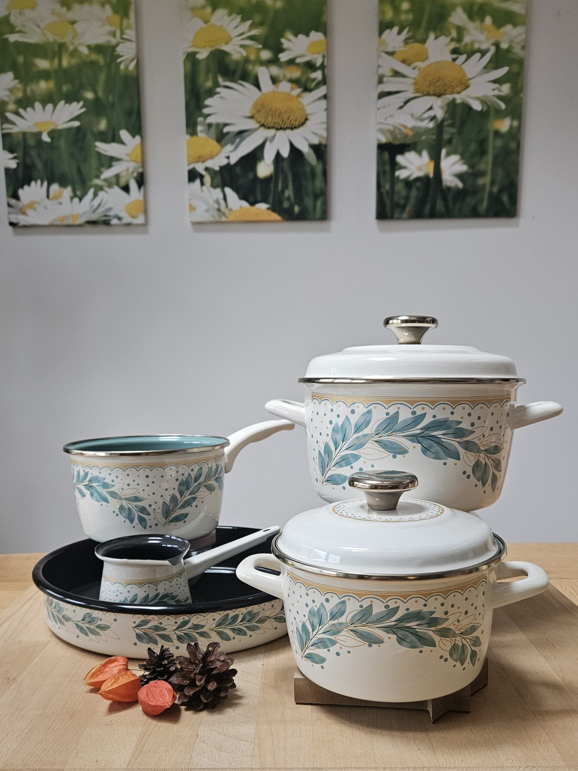 Komplet emajlirane posode vsebuje 2 različni velikosti kozici s pokrovkama, kozico z enim ročajem brez pokrovke, džezvo in okrogli pekač. Vse posode so primerne za  uporabo na vseh kuhališčih, tudi na indukciji.