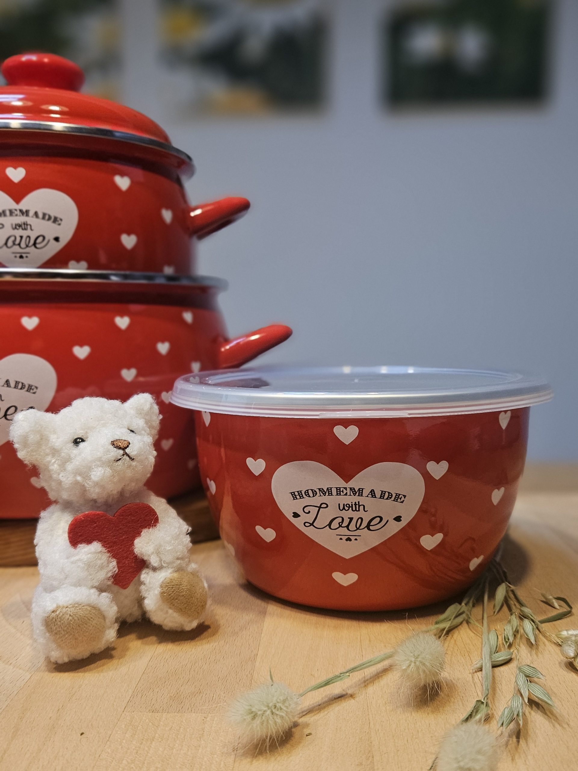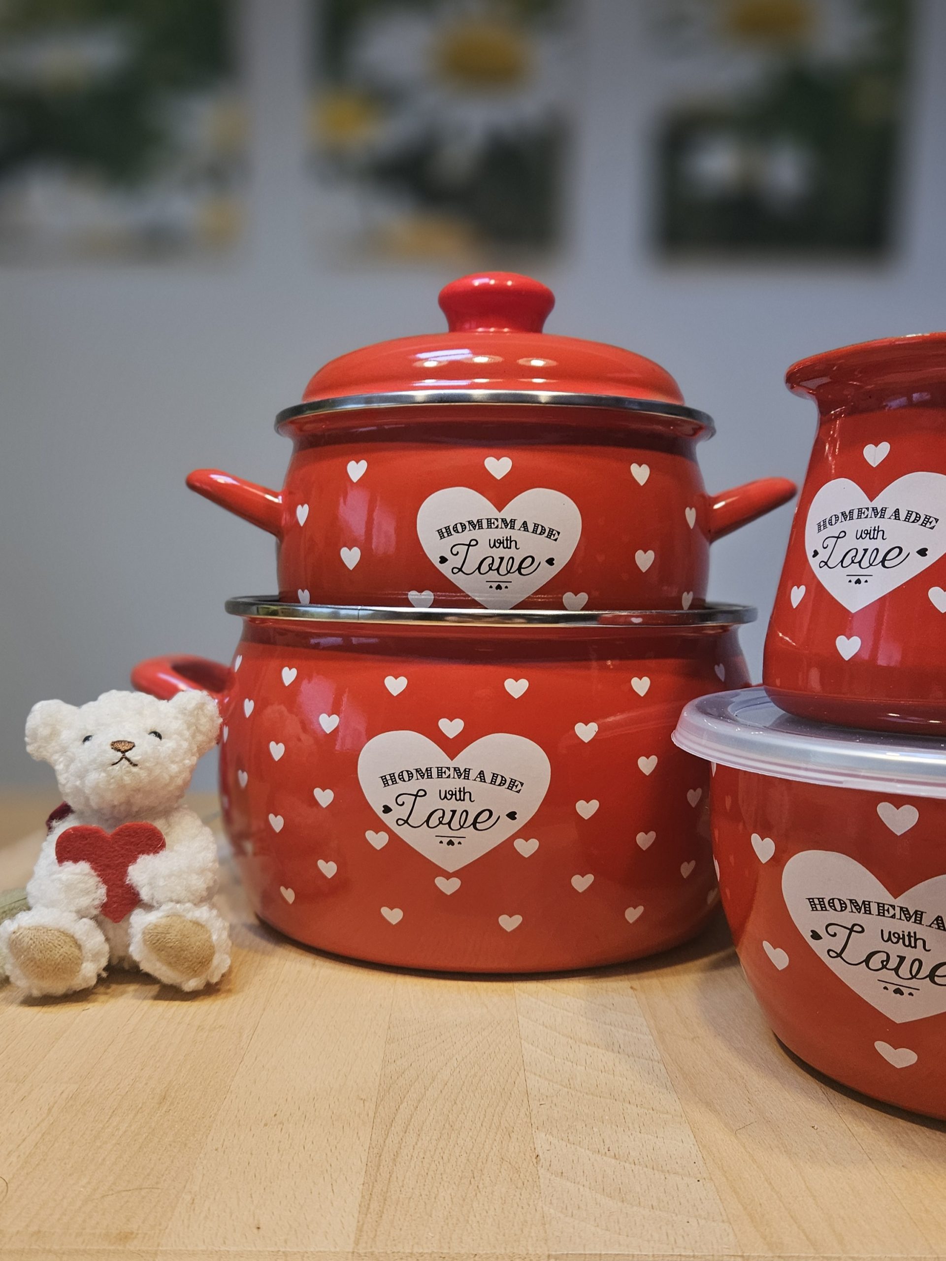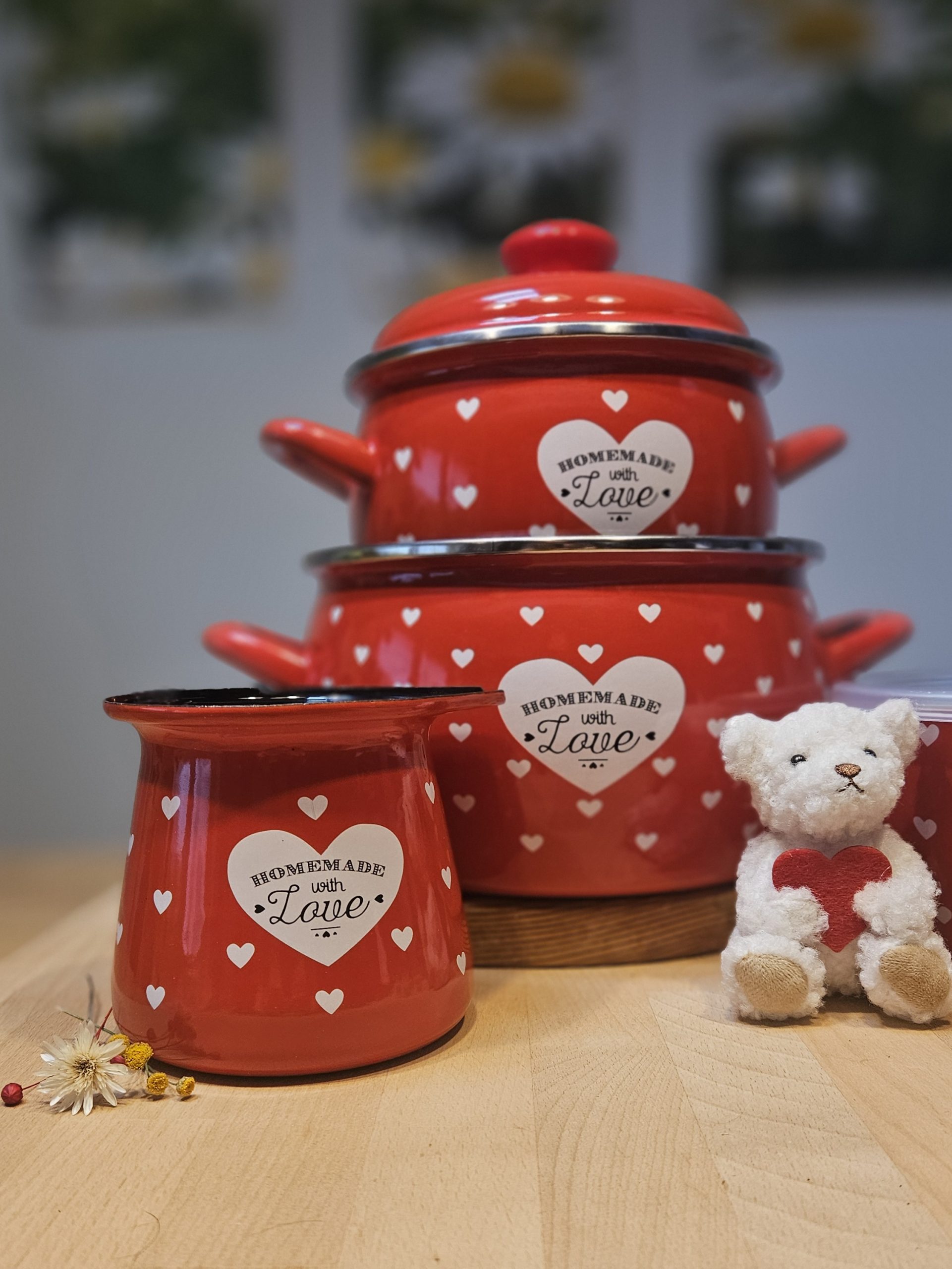 Komplet emajlirane posode vsebuje 2 velikosti kozic s pokrovkami, džezvo in večnamensko posodo. Vse posode so primerne za uporabo na vseh kuhališčih, tudi na indukciji.