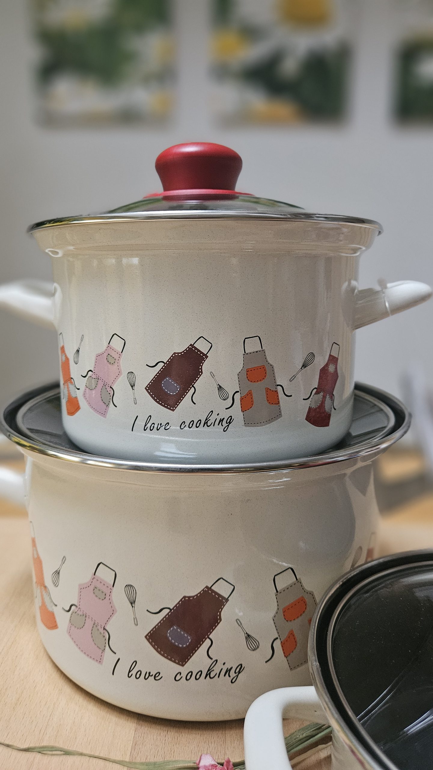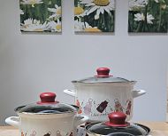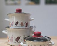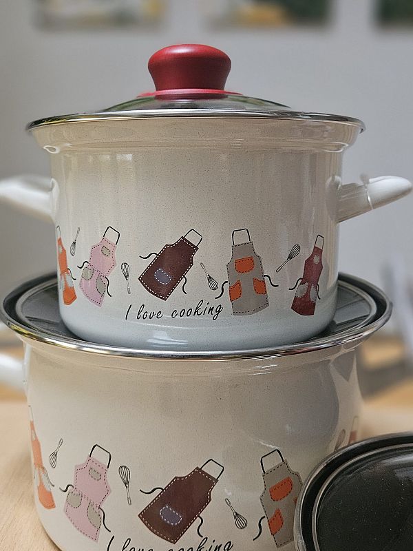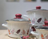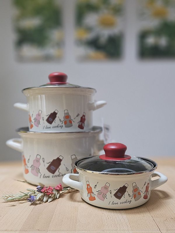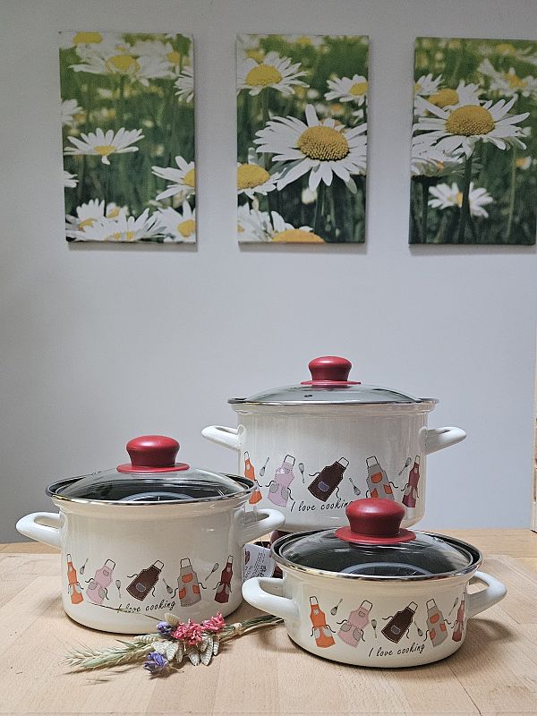 Komplet emajlirane posode vsebuje 3 različne velikosti kozic s steklenimi pokrovkami.Vse posode so primerne za uporabo na vseh kuhališčih, tudi na indukciji.