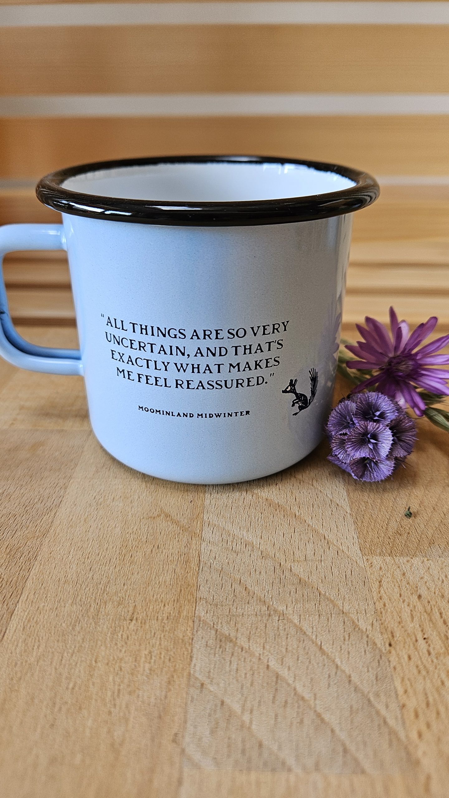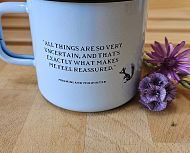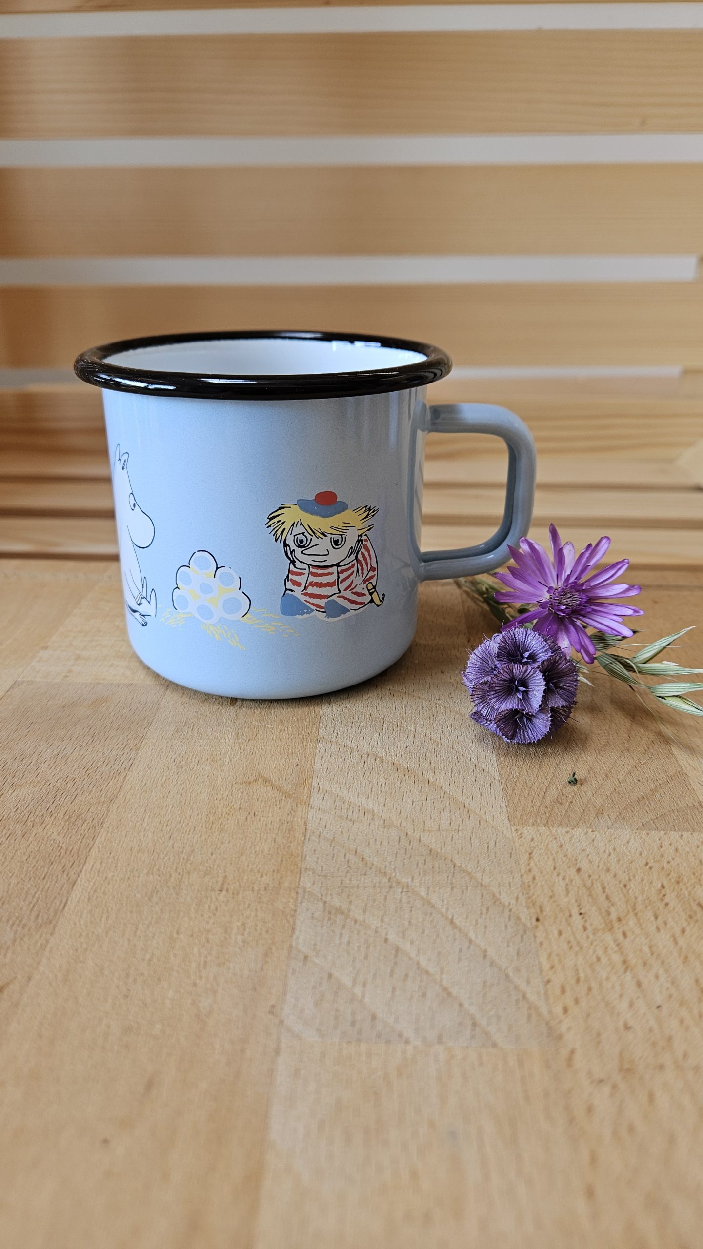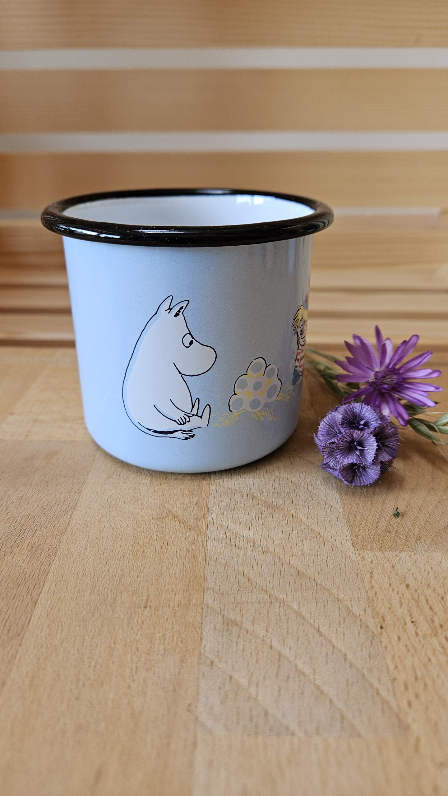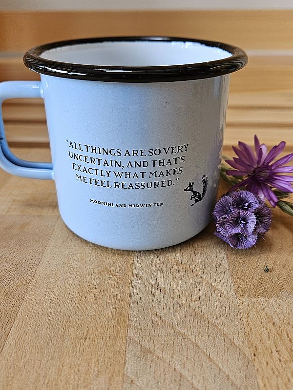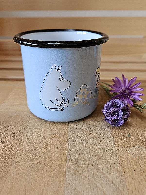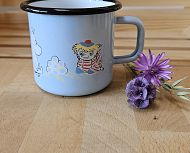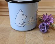 Svetlo moder emajliran lonček z motivom muminov. Lahko ga peremo v pomivalnem stroju. Drži 370 ml.