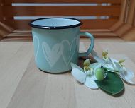 Emajliran lonček v svetlo modri barvi z motivi srčkov. Lahko ga peremo v pomivalnem stroju. Drži 370 ml.