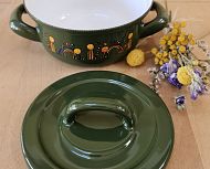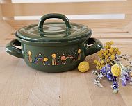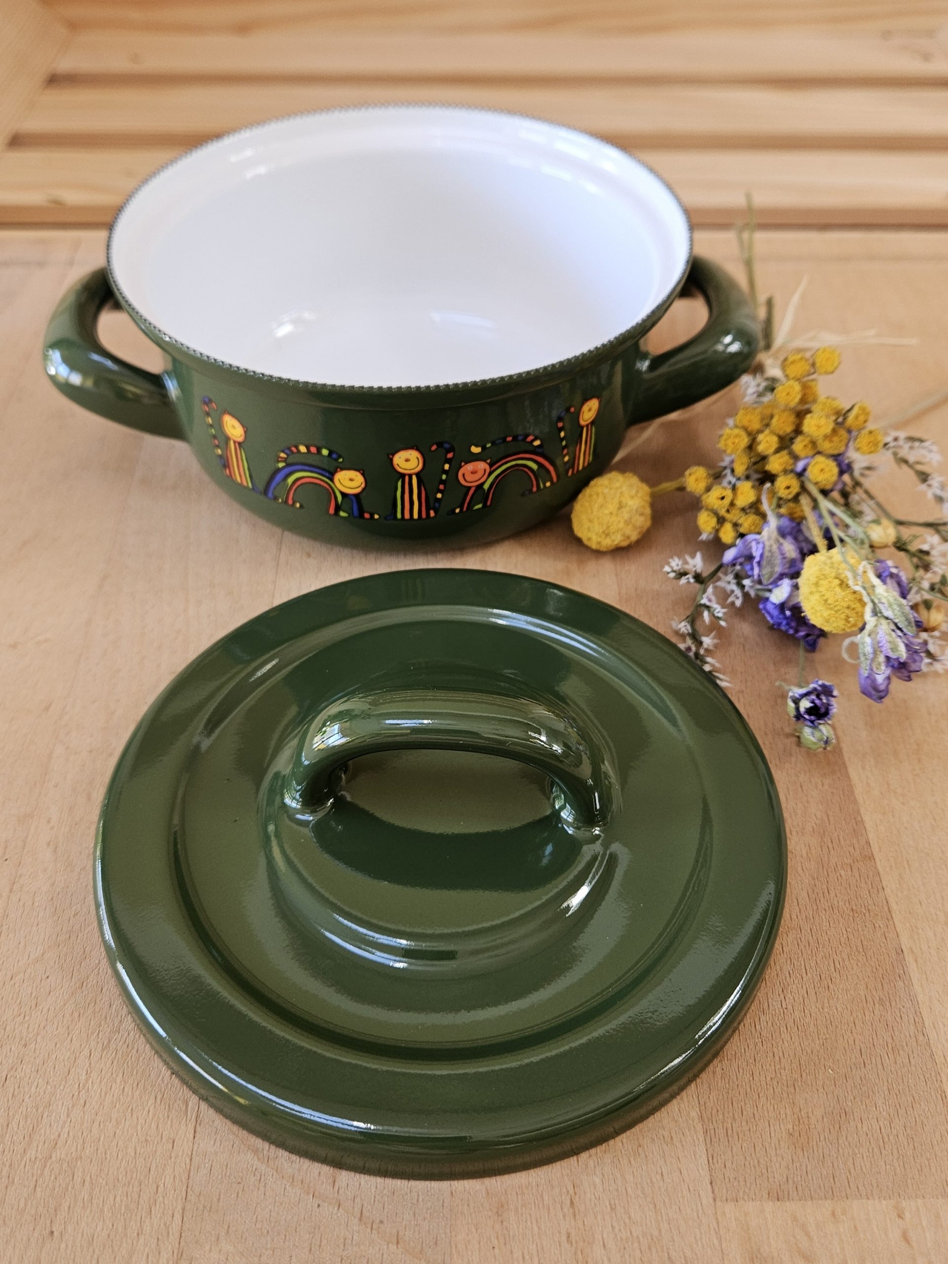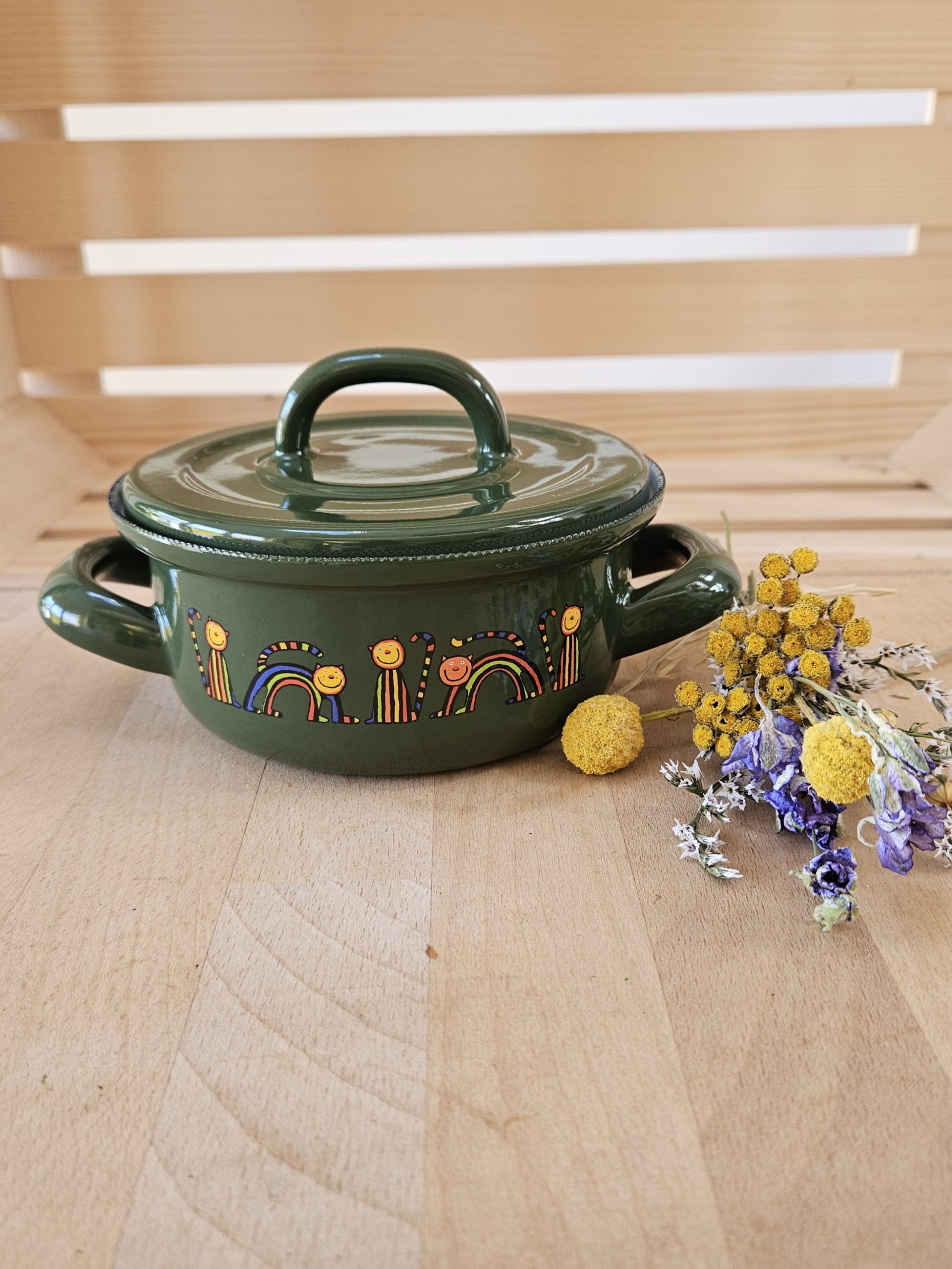 Emajlirana kozica s pokrovko v zeleni barvi z motivom pisanih muckov. Posoda je primerna za vsa kuhališča, tudi za indukcijo. Proizvajalec je Smaltum iz Češke.