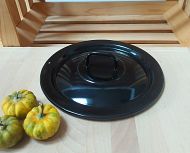 Pokrovka je emajlirana, črne barve. Premer 24 cm.